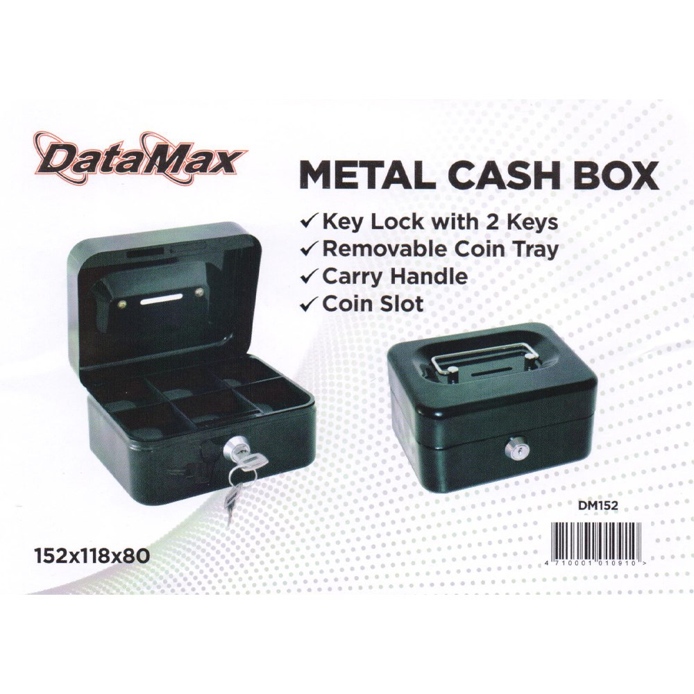 The DataMax DM152 Metal Cash Box with Coin Tray and Lock Black 152x118x80mm is ideal for holding extra cash. This DM152 currency box includes a convenient coin tray for easy sorting, identification, and counting. It also features a little hole in the lid where you may place money to save.
