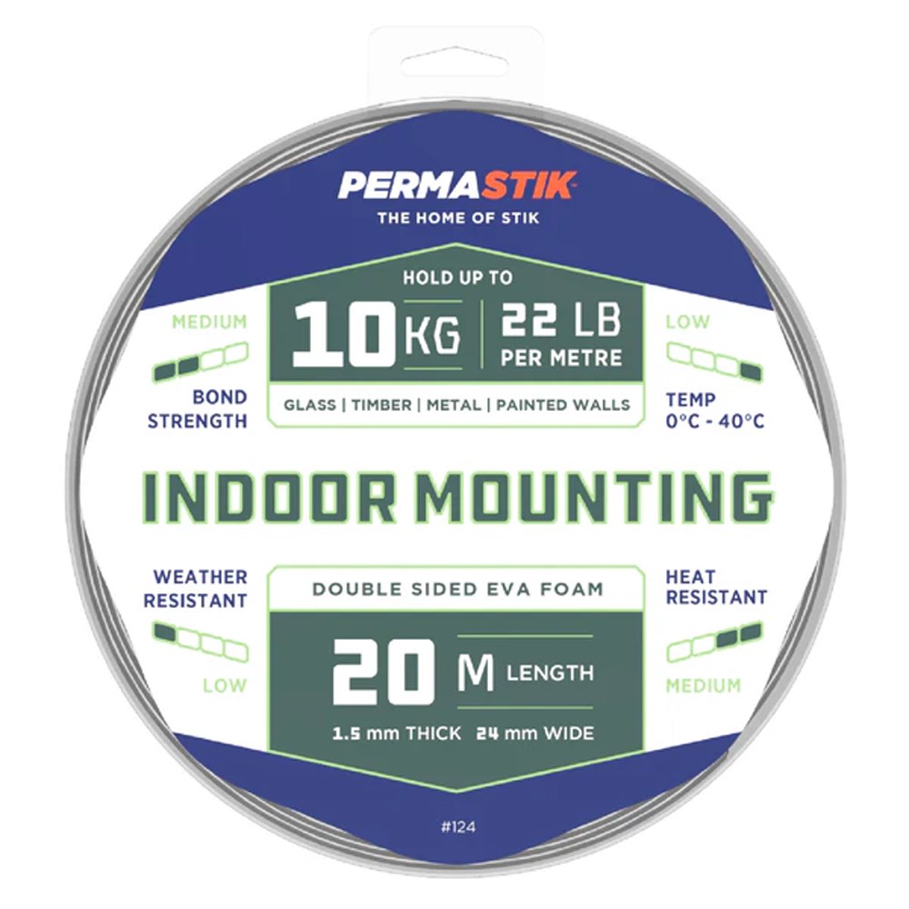Introducing the Permastik #124 Double-Sided EVA Foam Tape, your ultimate solution for indoor mounting needs! Measuring 20m in length and 1.5mm thick with a generous 24mm width, this tape boasts a strong hold of up to 10kg on various surfaces, including glass, timber, and painted walls. Ideal for home or office use, it offers medium bond strength, ensuring your items stay securely in place. While it’s low weather resistant and medium heat resistant, it excels in indoor applications. Transform your space effortlessly with this versatile, reliable mounting tape available at Theodist. Perfect for any project in Papua New Guinea!
