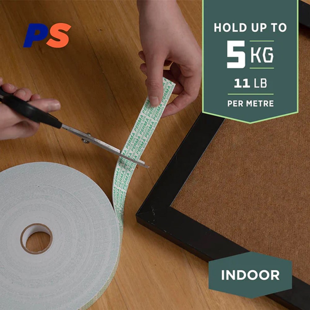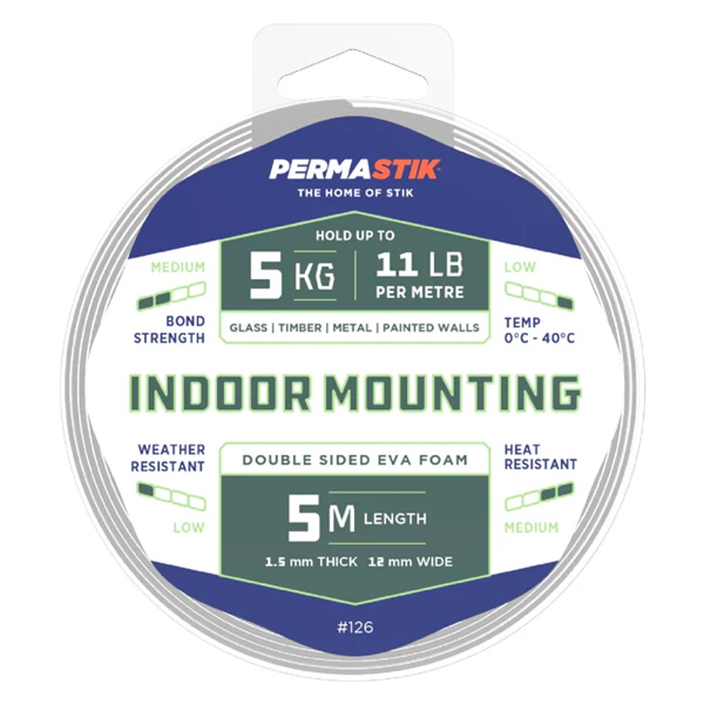Introducing Permastik #126 Double Sided EVA Foam Tape, your go-to solution for all your mounting needs! Measuring 5m in length, 1.5mm thick, and 12mm wide, this versatile tape provides a strong bond that can hold up to 5kg on various surfaces, including glass, timber, metal, and painted walls. Ideal for indoor use in both home and office settings, it offers medium bond strength and is designed for low weather and medium heat resistance. Whether you're decorating, repairing, or organising, Permastik #126 ensures reliable adhesion for your projects in Papua New Guinea. Experience convenience and durability with every roll!