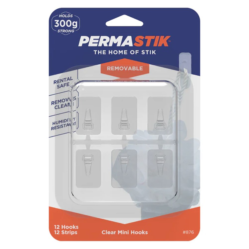 Introducing Permastik #876 Clear Mini Hooks, the ultimate solution for tidy spaces in your home or office! Each pack includes 12 mini hooks and 12 easy-to-use strips, expertly designed to hold up to 300g. These hooks are rental safe, ensuring they won't damage your walls while providing a reliable hanging solution. Their humidity-resistant design makes them perfect for the unique climate of Papua New Guinea. Effortlessly remove them clean without leaving a trace. Whether you're organising your workspace or decorating your living area, Permastik mini hooks are here to streamline your space with style and strength!