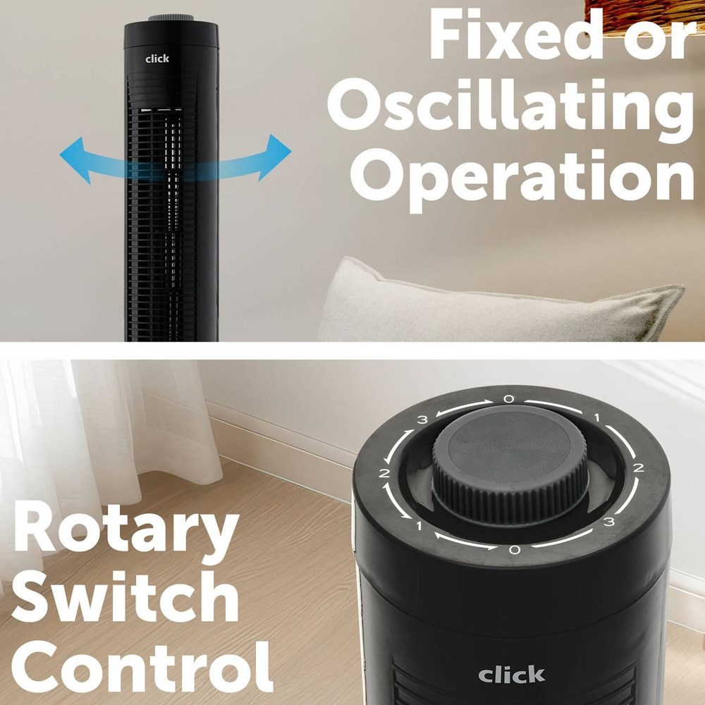 Stay cool and comfortable with the Click 0816288 81cm Tower Fan, designed for both home and office use in Papua New Guinea. This sleek black fan features three adjustable speed settings, ensuring you can customise your cooling experience. Measuring 26.5cm in width and 81cm in height, it fits perfectly into any space. The user-friendly rotary switch control allows for easy operation, while its fixed or oscillating modes provide versatile airflow options. Plus, the convenient carry handle makes it easy to move from room to room. Beat the heat with this powerful and stylish tower fan!